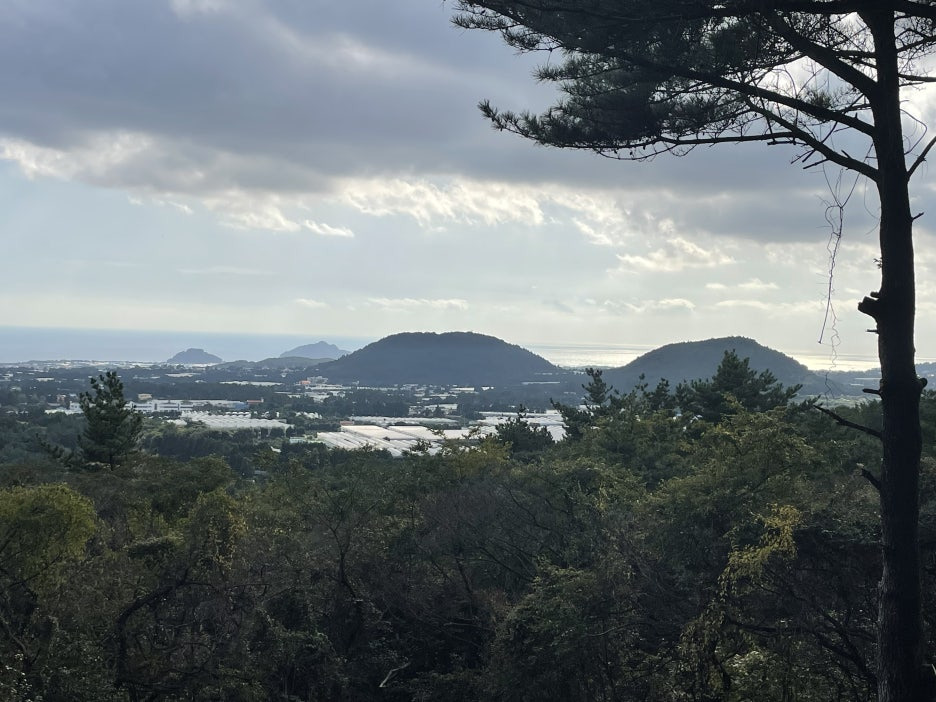 산바당전망대에서 보이는 제지기오름, 섶섬, 칡오름, 영천악이 무척 곱다.