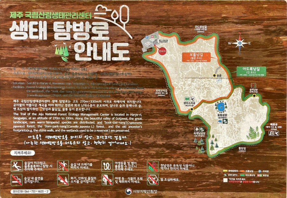 제주국립산림생태관리센터 중앙에서 걸어들어오면 꼬닥꼬닥길을 거쳐 물통을 보고 다시 돌아나와 숙대낭길과 돌담길, 베롱곶, 돔박낭곶을 지나 간드랑낭길로 빠져나온다.