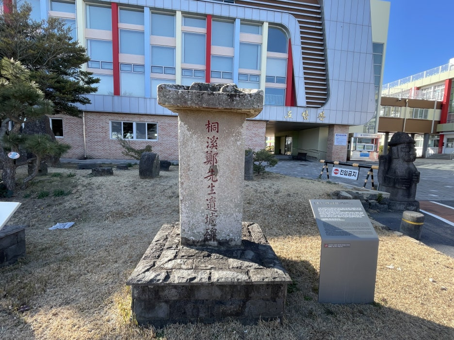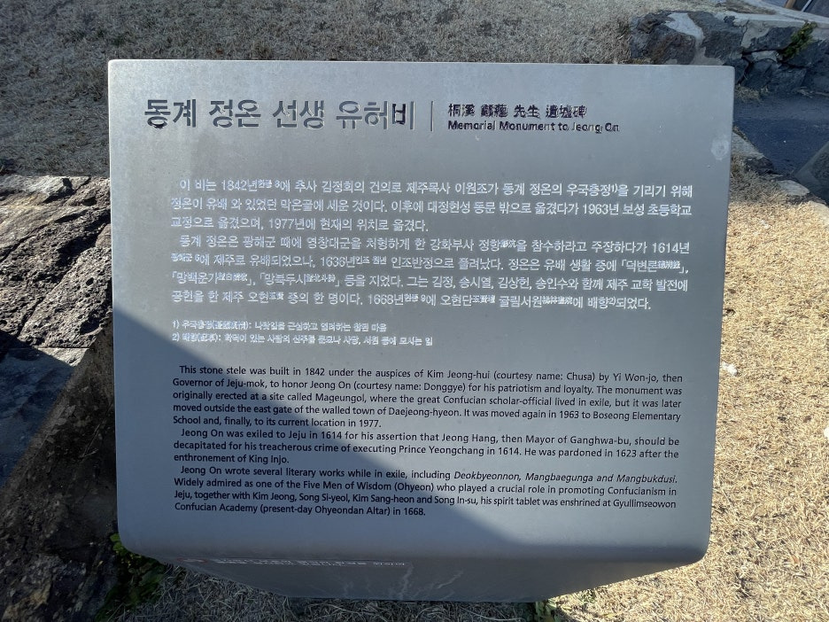 동계 정온은 1614년부터 1623년까지 대정현 동문 안에 위리안치되어 있었다. 이후 추사 김정희의 건의에 의해 1842년 헌종 8년에 제주목사 이원조가 대정현성 동문 밖에 ‘정온 유허비’를 세웠는데 1963년에 옛 대정현의 객사가 있던 보성초등학교 교정으로 옮겨졌다.