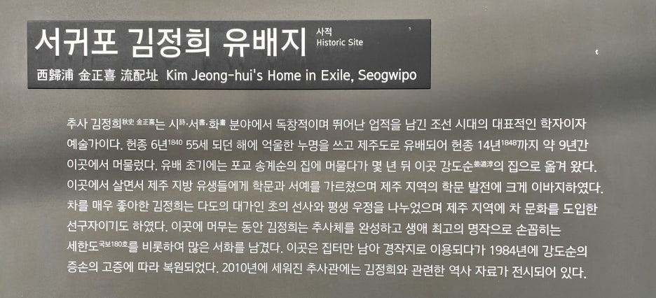 추사는 유배 초기 1840년에 송계순의 집에 위리안치되어 있다가 1842년경 강도순의 집 모거리로 거처를 옮겼다. 추사는 이곳을 귤중옥橘中屋이라고 부르기도 했다. 현재의 추사적거지는 1948년 4·3 사건으로 불타 없어진 것을 1984년 강도순 증손의 고증을 통해 복원한 것이다.