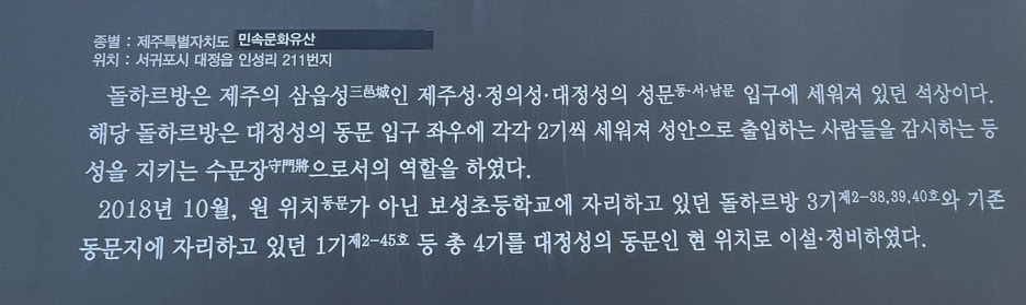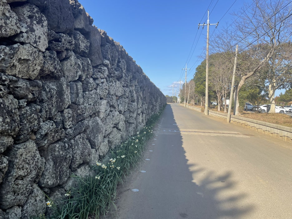동문밖에는 삼의사비와 돌하르방들이 모여 있고, 성안으로 들어서면 수선화와 추사적거지와 흑룡장성이라는 돌담길이 한없이 이어진다. 보성초등학교에 들러 대정골의 여러 공덕비를 만나고 나오면 두레물 옆에서 이재수의 이야기도 들을 수 있다.