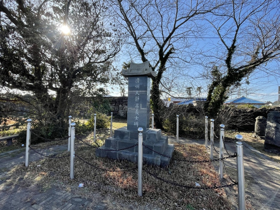 제주대정삼의사비. 이재수, 오대현, 강우백 등 삼의사三義士의 뜻을 기리는 비석이다.