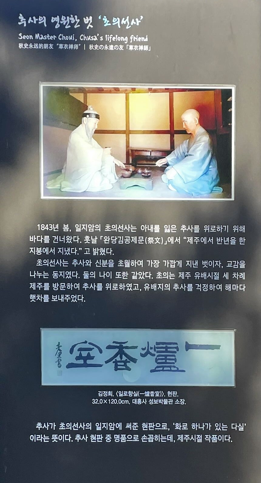 이곳에 초의선사가 찾아왔다. 추사와 초의의 금란지교는 겨울에 만나는 수선화와 같았다. 수선화를 바라보며 마시는 한 잔 차와 같았다. 그 둘은 서른살 즈음에 만났다. 둘은 동갑이었다.